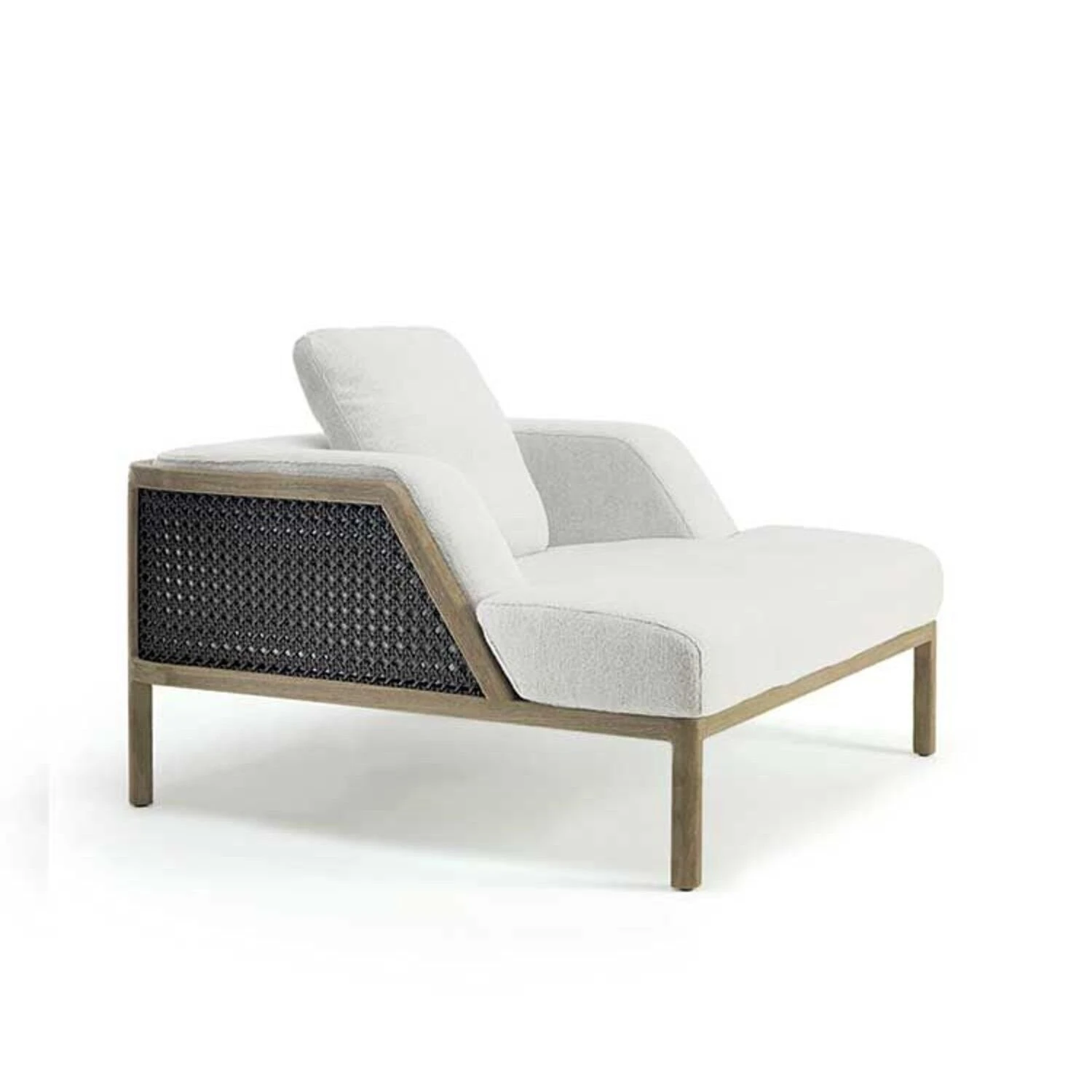 Коллекция Grand Life предлагает диваны и кресла для отдыха с большими пропорциями, решительной архитектурой, чистые и необходимые, с отделкой с тонкими деталями; структура мебели изготовлена из тикового дерева с металлической сердцевиной, а спинки различных типов сидений созданы из мудрого и изысканного переплетения акриловой веревки.