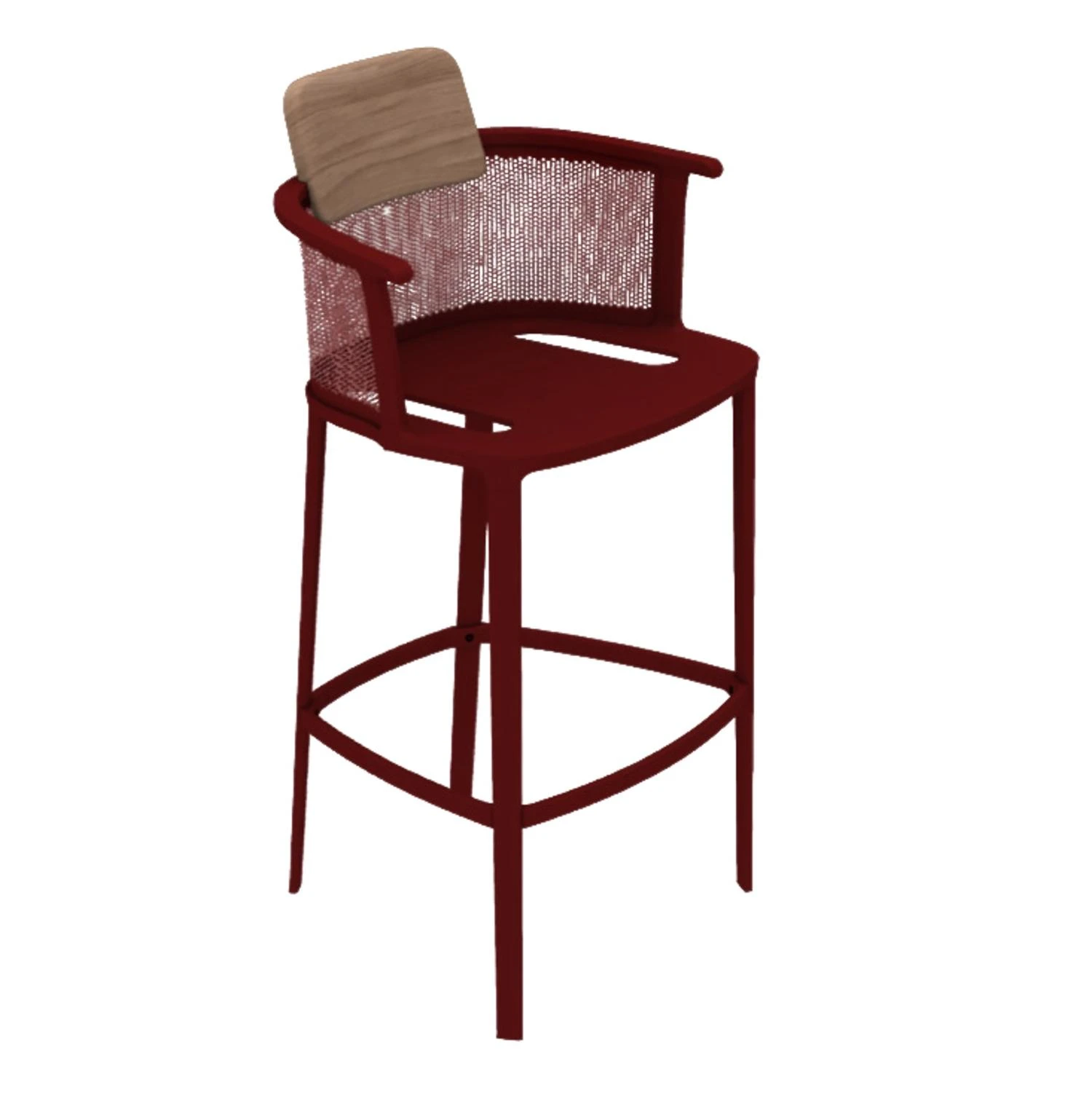 Барный стул изготовлен из алюминия. Спинка обтянута тканью с жесткой складкой и имеет накладку из натурального тика. Подушка сидения имеет наполнение из синтетического полиуретана. Все материалы прекрасно отводят влагу, что делает изделие подходящим для использования на открытом воздухе.