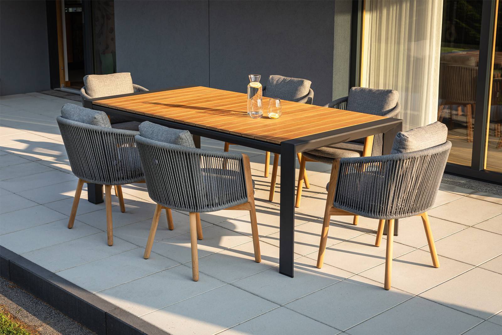 Сочетание элегантного стола MURO и шести удобных стульев Haven Teak в антрацитовом цвете создает уникальную атмосферу, в которой каждый момент на открытом воздухе становится незабываемым.