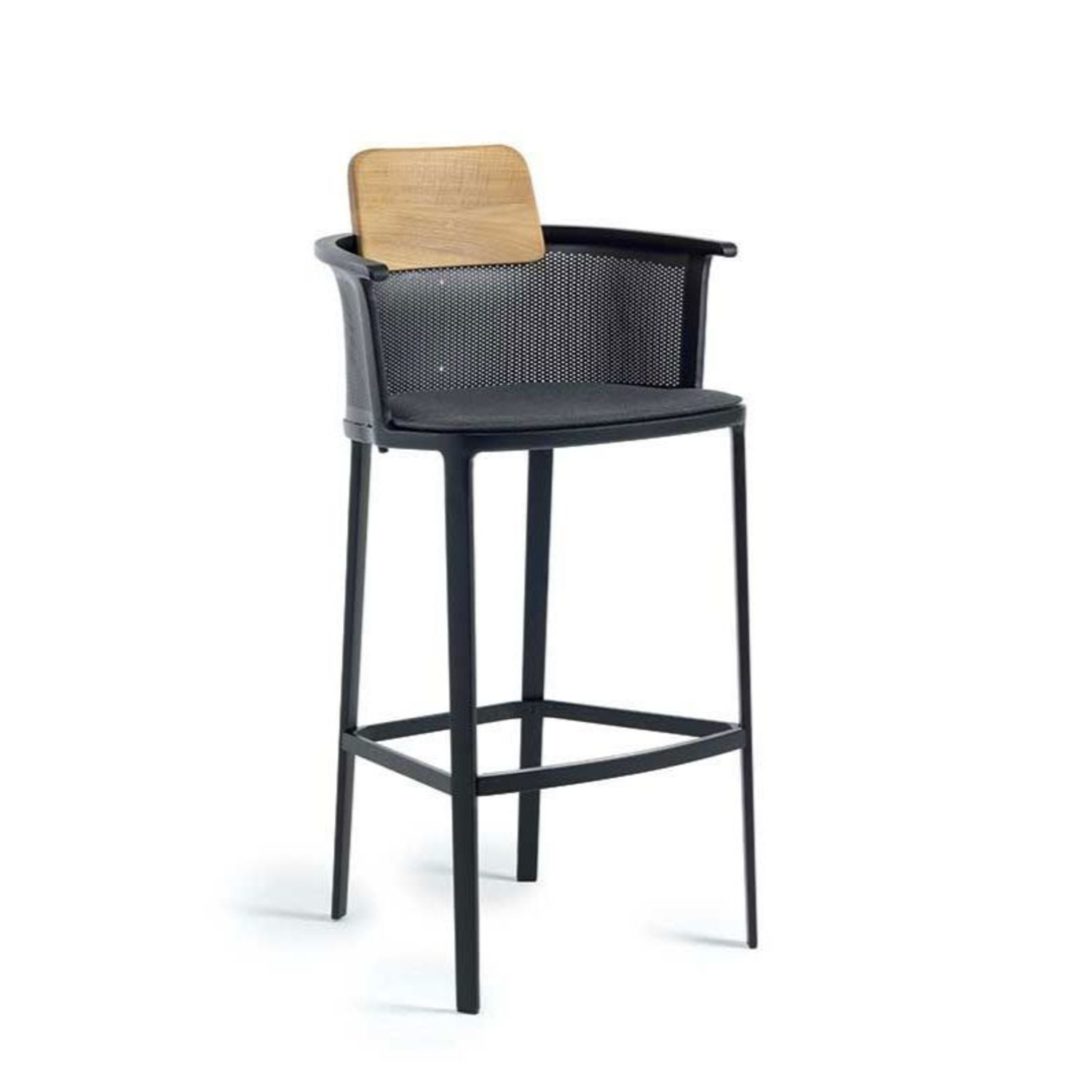 Барный стул изготовлен из алюминия. Спинка обтянута тканью с жесткой складкой и имеет накладку из натурального тика. Подушка сидения имеет наполнение из синтетического полиуретана. Все материалы прекрасно отводят влагу, что делает изделие подходящим для использования на открытом воздухе.