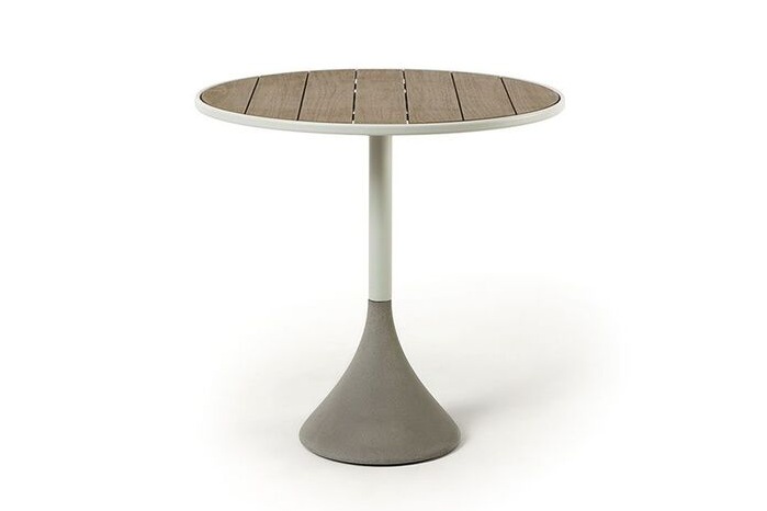 Стол Concreto с прочным цементным основанием имеют алюминиевую конструкцию и столешницы из тикового дерева.