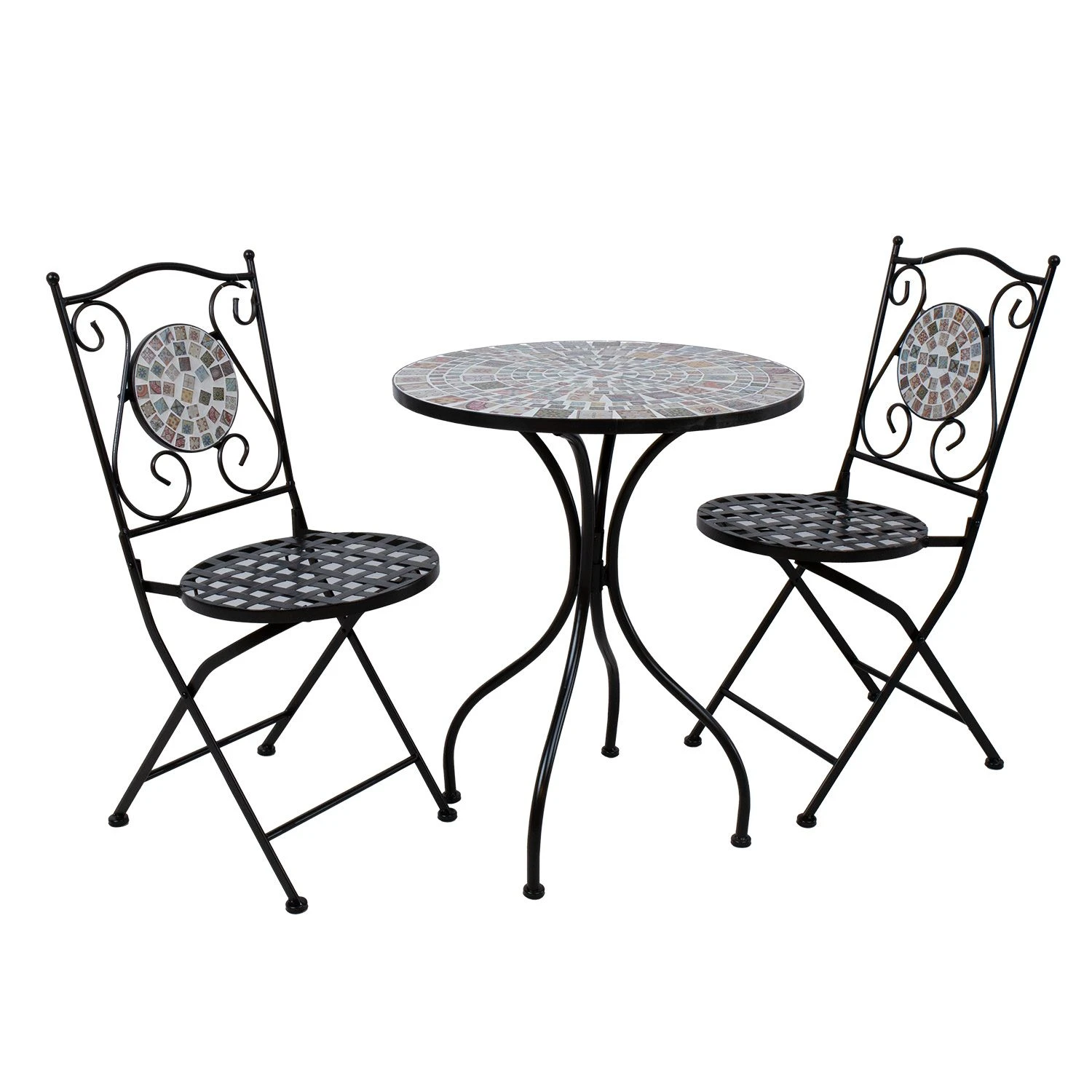 Столешница и спинки стульев украшены красивой мозаикой, выполненной из узорчатой плитки на светлом фоне. Этот дизайн придаст вашему балкону изысканность и стиль.