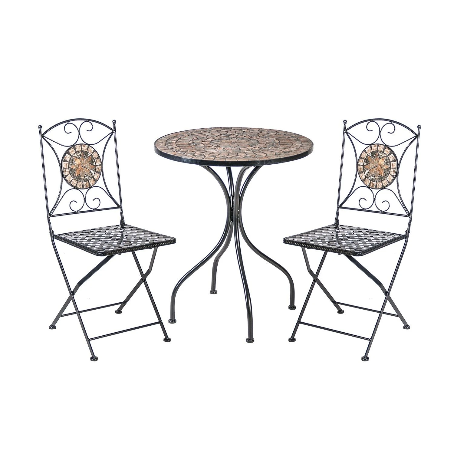 Этот элегантный дуэт, созданный для двоих, состоит из стола диаметром 60 сантиметров и двух складных стульев с высотой 90 сантиметров. Сочетание стали, покрытой порошковой краской, и мозаичной каменной плитки создает интригующий контраст, который добавит изысканности вашему открытому пространству.