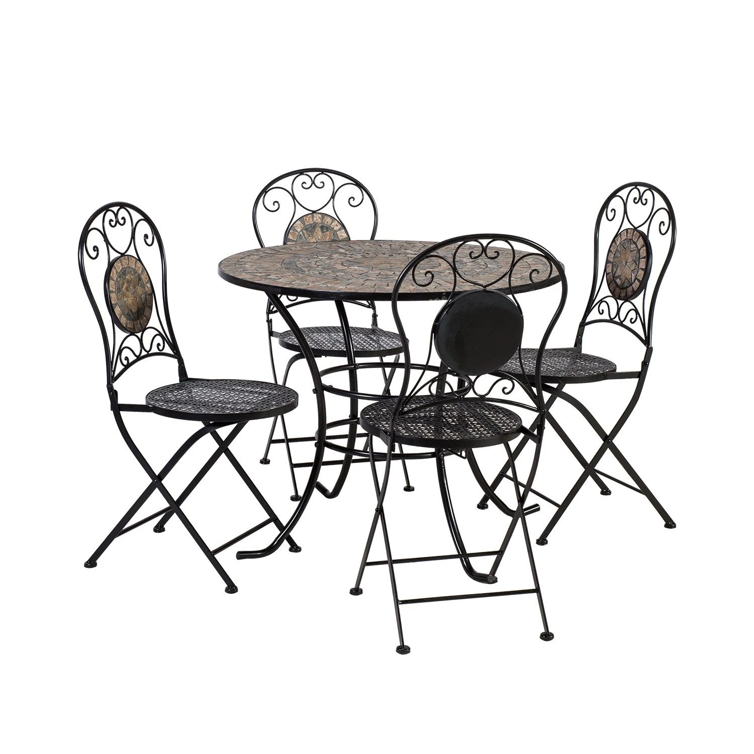 Мозаичные вставки из натурального камня на столе и стульях придают комплекту уникальный и утонченный вид. Каждый элемент представляет собой настоящее произведение искусства, раскрывая красоту природных материалов. Благодаря тщательному подбору камней создается замысловатый узор, обеспечивающий визуальное наслаждение.