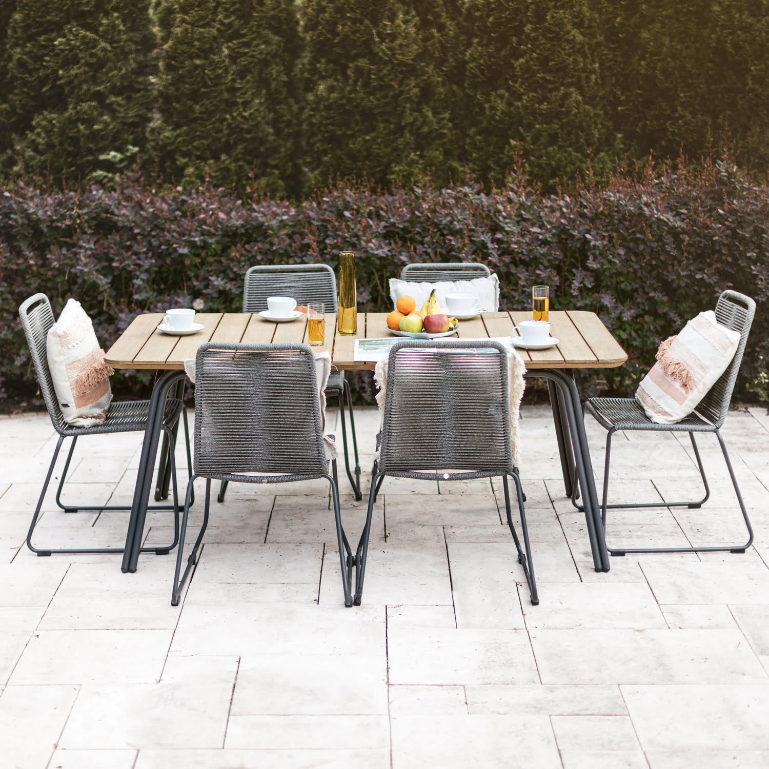 Садовый комплект SIMI 180 + ELOS оценят любители эстетики и нетривиального дизайна. Фантастические стулья ELOS, спинки и сиденья которых образуют прочные веревки, выглядят феноменально. Вы можете сидеть сложа руки и купаться в приятных лучах солнца. Прямоугольный стол SIMI имеет столешницу из эвкалипта, который является одним из самых твердых видов в мире. Это делает его прочным и устойчивым к механическим повреждениям. И при этом производит невероятное впечатление. Минималистичный дизайн порадует всех с первого взгляда. Удобная садовая мебель в натуральных тонах идеально подойдет на любой террасе или в саду.