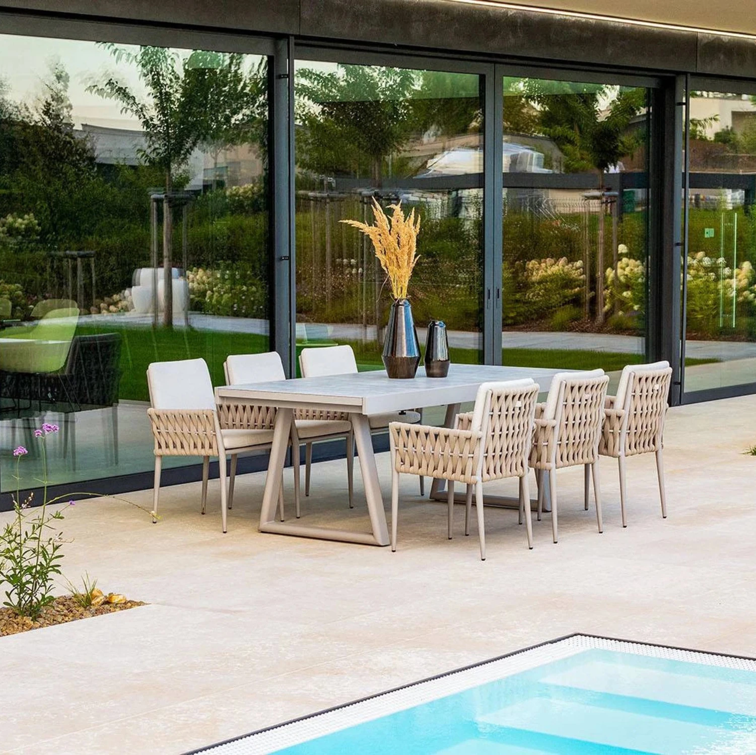 Сочетание стильного клубного стола с шестью удобными стульями HUG серо-бежевого цвета создает неповторимую атмосферу, делая каждый момент, проведенный на свежем воздухе, незабываемым. Стулья HUG обеспечивают исключительный комфорт, а их современный дизайн идеально сочетается с элегантным клубным столом.