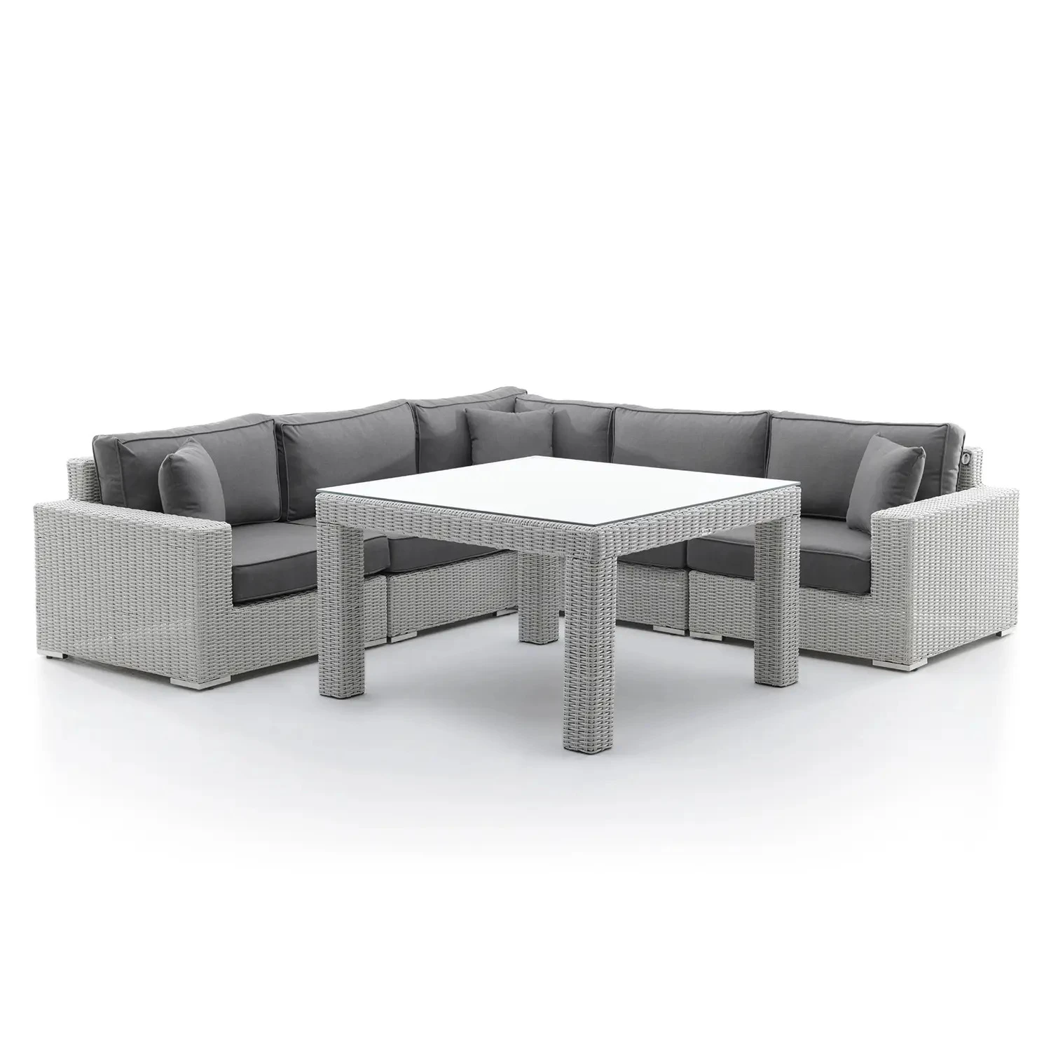 Стильная мебель для террасы MILANO III в белом цвете вызовет вау - фактор и будет радовать вас каждый день. Удобный уголок, мягкие серые подушечки и аккуратный квадратный столик с закаленным стеклом создают композицию, которая идеально смотрится на фоне зелени, деревьев и цветов. Проведение времени на свежем воздухе может стать настоящим удовольствием для чувств. Красивый дизайн, функциональность и тщательность исполнения делают этот набор садовой мебели для истинных энтузиастов нетривиальных, роскошных проектов.
