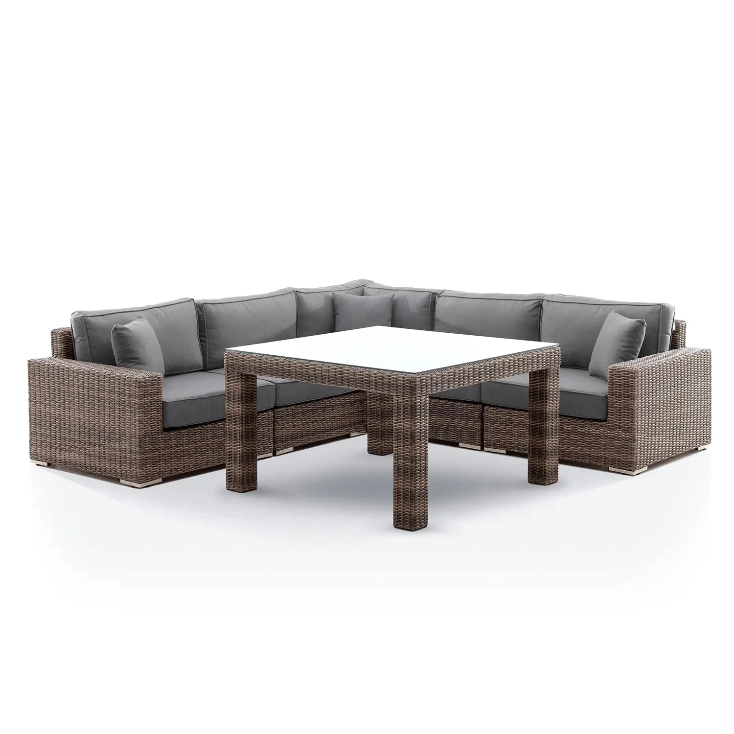 Стильная мебель для террасы MILANO III в песочном цвете вызовет вау - фактор и будет радовать вас каждый день. Удобный уголок, мягкие серые подушечки и аккуратный квадратный столик с закаленным стеклом создают композицию, которая идеально смотрится на фоне зелени, деревьев и цветов. Проведение времени на свежем воздухе может стать настоящим удовольствием для чувств. Красивый дизайн, функциональность и тщательность исполнения делают этот набор садовой мебели для истинных энтузиастов нетривиальных, роскошных проектов.