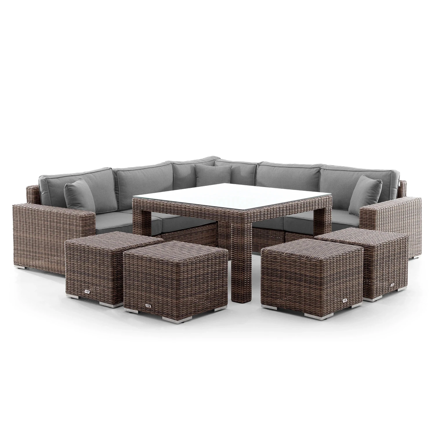 Эксклюзивная мебель для патио MILANO IV в песочном цвете позволяет вам расслабиться и обеспечить достаточное количество мест, чтобы сделать вашу вечеринку в саду по-настоящему успешной. Удобный уголок, мягкие серые подушки, аккуратные пуфы и функциональный квадратный столик из закаленного стекла изысканно смотрятся в окружении зелени деревьев и разноцветных цветов. Приготовьте вкусные закуски для барбекю и начните угощение для гурманов в зоне отдыха на заднем дворе.