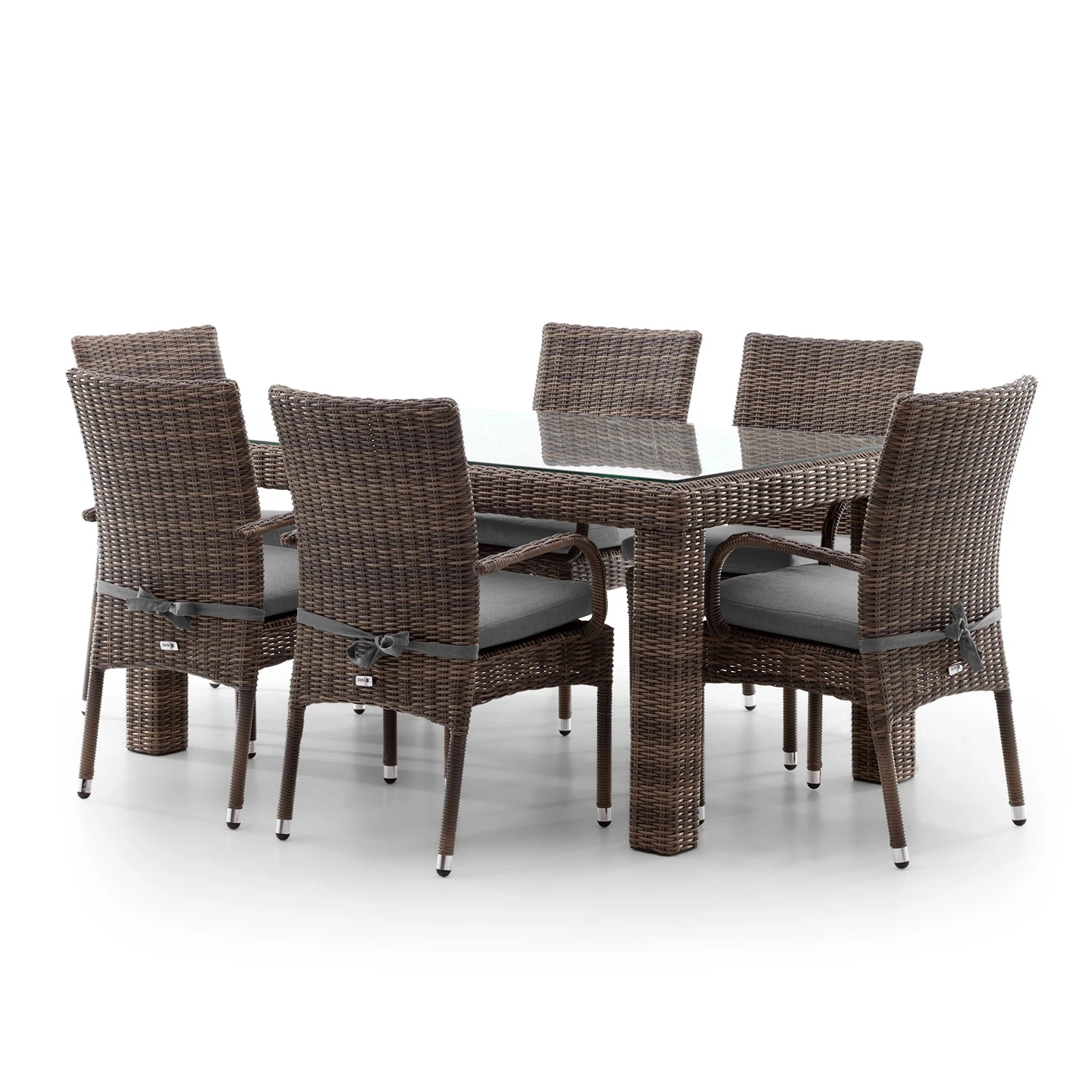 В комплект садовой мебели из искусственного ротанга RAPALLO 160 входят стол RAPALLO и шесть стульев TRAMONTO. Основным строительным блоком всех компонентов является искусственного ротанга - материал, устойчивый к воздействию внешних факторов, таких как экстремальные температуры, влажность или ультрафиолетовое излучение. Стол укрепляется стеклом из закаленного стекла – на него можно без опасений ставить горячую и тяжелую посуду. Стулья, в свою очередь, восхищают своим комфортом, который обеспечивают идеально очерченные подлокотники и мягкие сиденья из пенопласта.