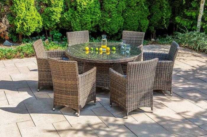 Раскидистый, декоративный, долговечный – можно ли мечтать о лучшем компаньоне для садовых встреч? Стол диаметром 130 см вмещает до шести человек одновременно. Полностью сплетенный из искусственного ротанга, он образует прочную конструкцию, устойчивую к воздействию внешних факторов, таких как экстремальные температуры, осадки и ультрафиолетовое излучение. Дополнительной защитой для столешницы является закаленное стекло толщиной 8 мм, которое не страшна тяжелая и горячая посуда.