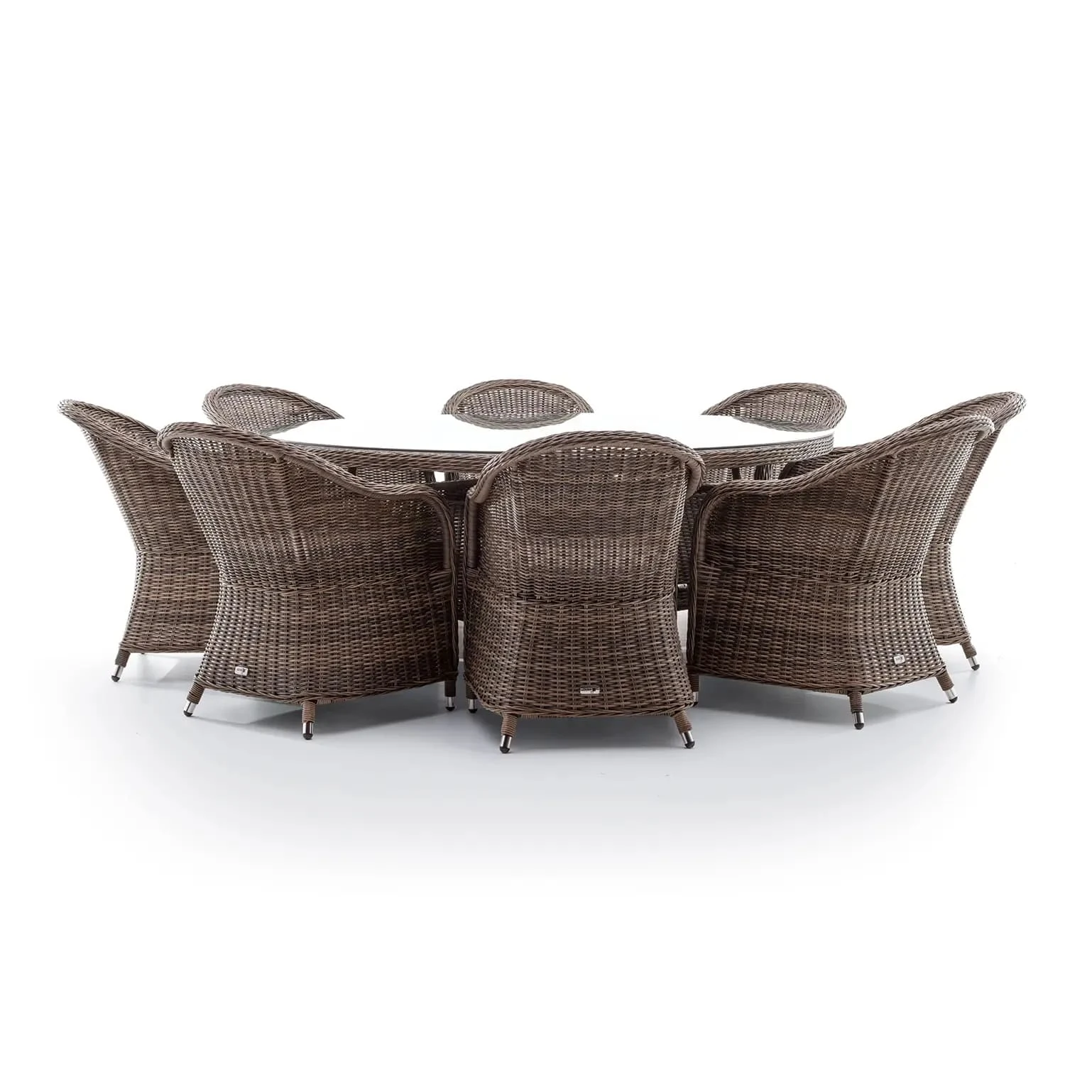 В комплект входят: стол RONDO диаметром 180 см и восемь кресел серии LEONARDO. Благодаря идеальному контуру, мягким подушкам сидений и удобной поддержке, LEONARDO значительно отстает от своих конкурентов, уступая по удобству лучшим сиденьям в салоне. Столешница RONDO, полностью сотканная из искусственного ротанга, усилена закаленным стеклом толщиной 8 мм, поэтому вы можете без опасений ставить на нее тяжелую посуду и горячие тарелки. Использование лучших материалов, среди которых лидирует искусственного ротанга, дает вам гарантию того, что ваша любимая мебель прослужит долгие годы.