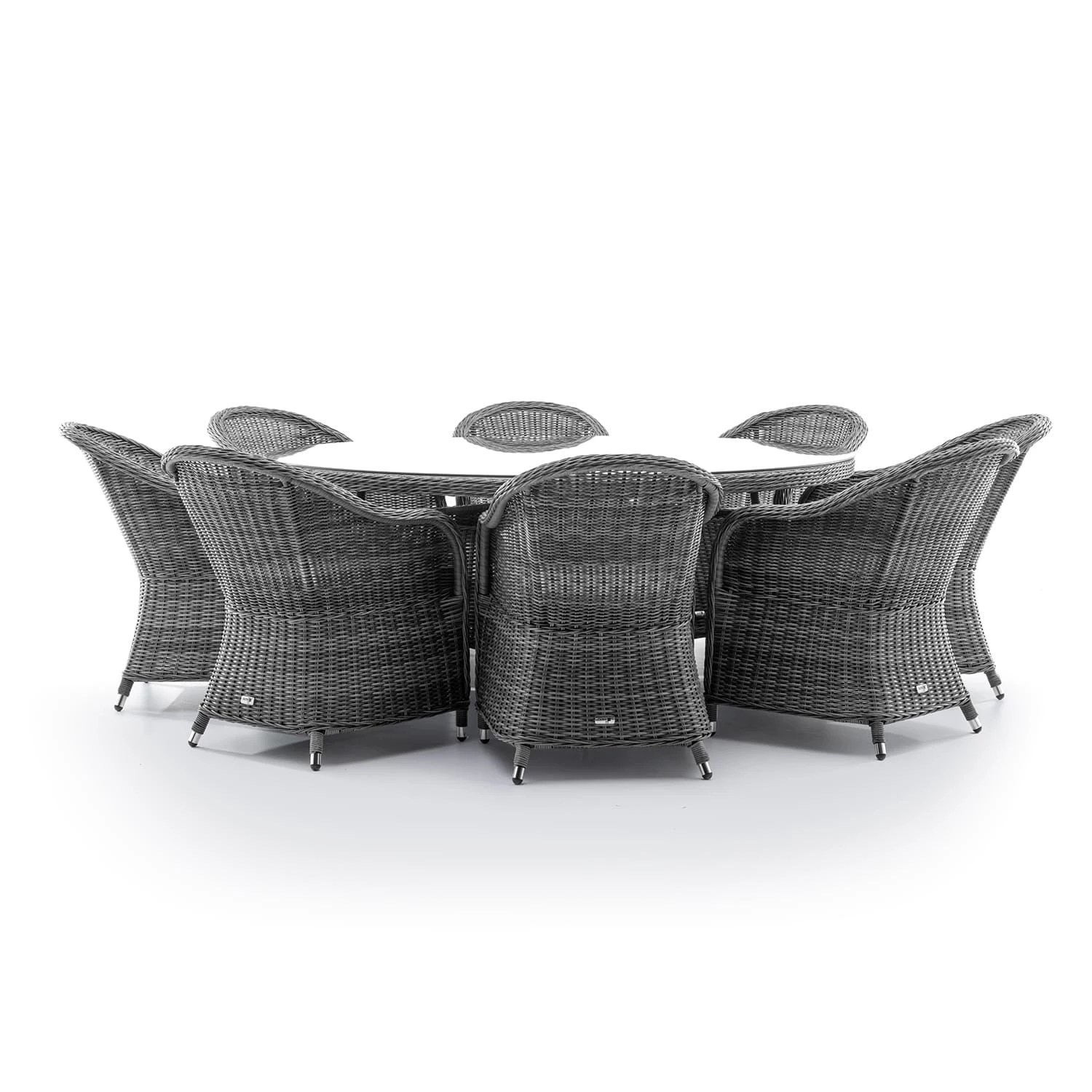 В комплект входят: стол RONDO диаметром 180 см и восемь кресел серии LEONARDO. Благодаря идеальному контуру, мягким подушкам сидений и удобной поддержке, LEONARDO значительно отстает от своих конкурентов, уступая по удобству лучшим сиденьям в салоне. Столешница RONDO, полностью сотканная из искусственного ротанга, усилена закаленным стеклом толщиной 8 мм, поэтому вы можете без опасений ставить на нее тяжелую посуду и горячие тарелки. Использование лучших материалов, среди которых лидирует искусственного ротанга, дает вам гарантию того, что ваша любимая мебель прослужит долгие годы.