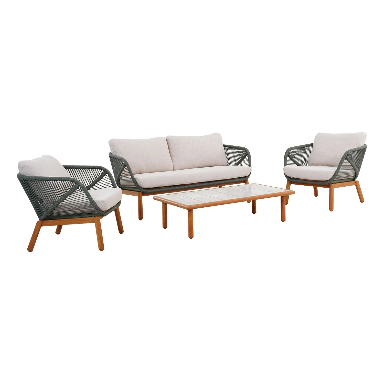 Оригинальный декор: Спинки дивана и стульев украшены стильным зеленым плетением из веревок, придающим комплекту неповторимый и современный вид.