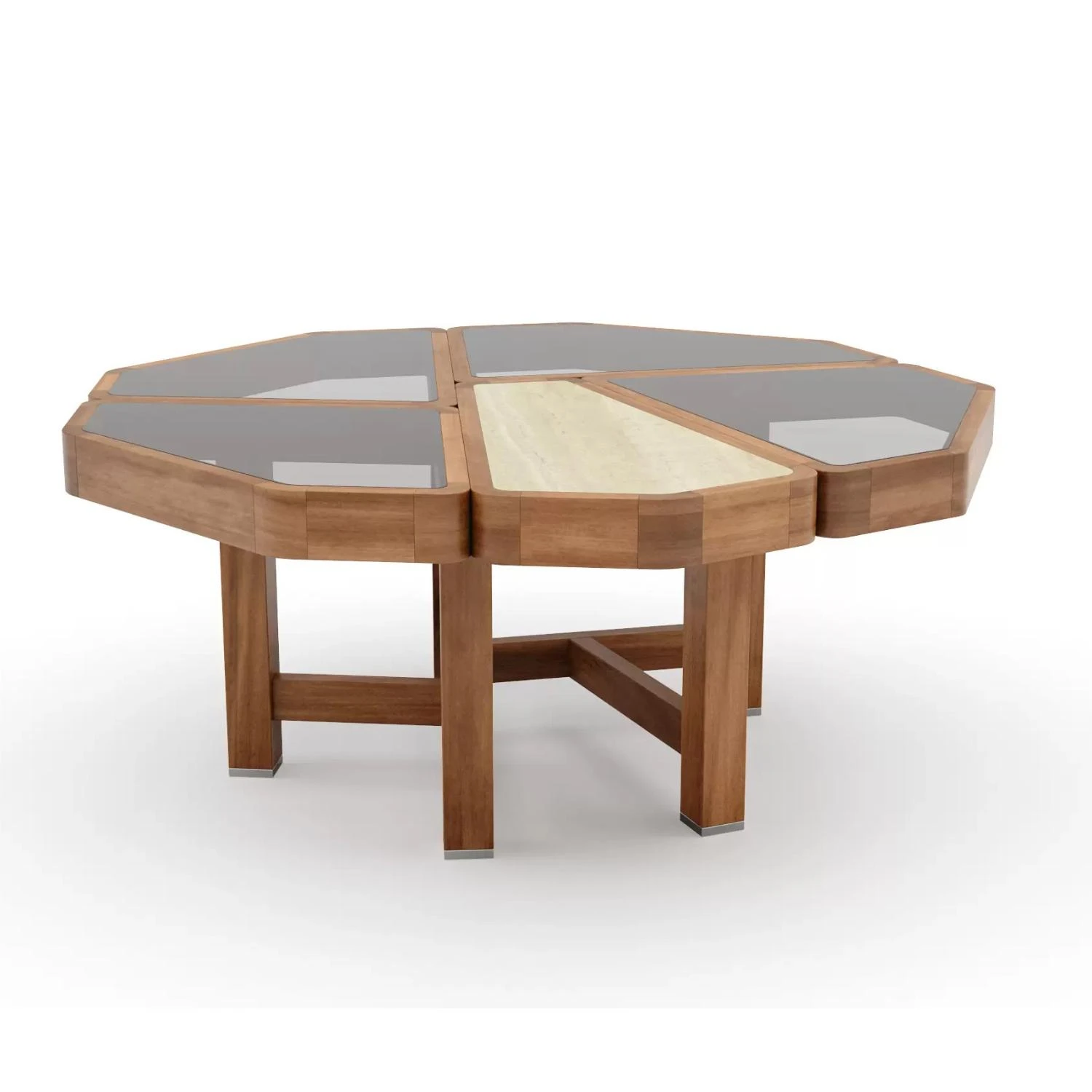 Изысканность столешницы подчеркивается гранями из африканского ироко – ценной породы дерева, славящейся своей уникальной текстурой, глубоким цветом и исключительной устойчивостью к влаге и перепадам температур. Ироко придает столу теплоту, природную красоту и неповторимый шарм, делая каждую деталь уникальной.