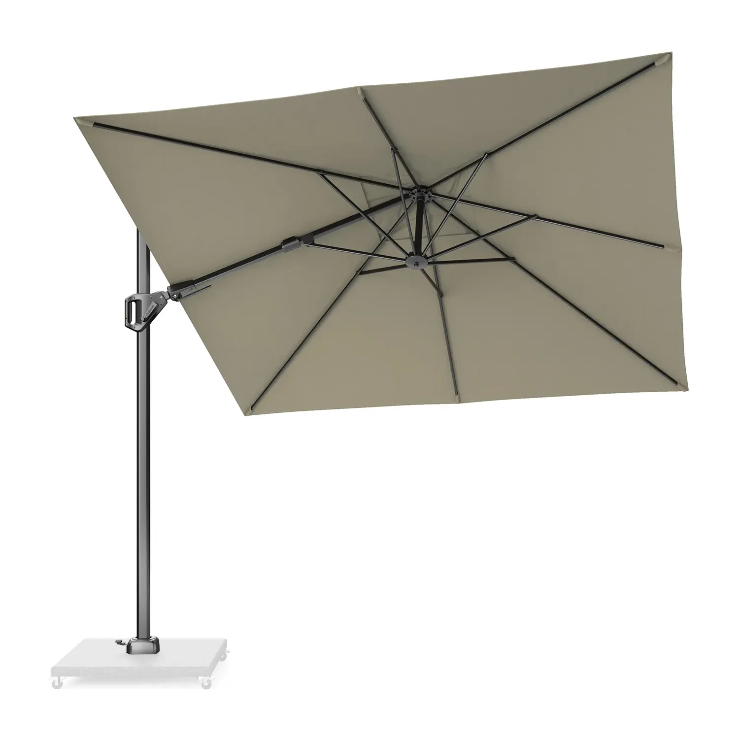 Voyager T² оснащен полностью алюминиевой мачтой и прочными стальными ребрами. Такое соединение обеспечивает прочную конструкцию. Этот зонт легко поворачивается на 360° или наклоняется назад и из стороны в сторону.