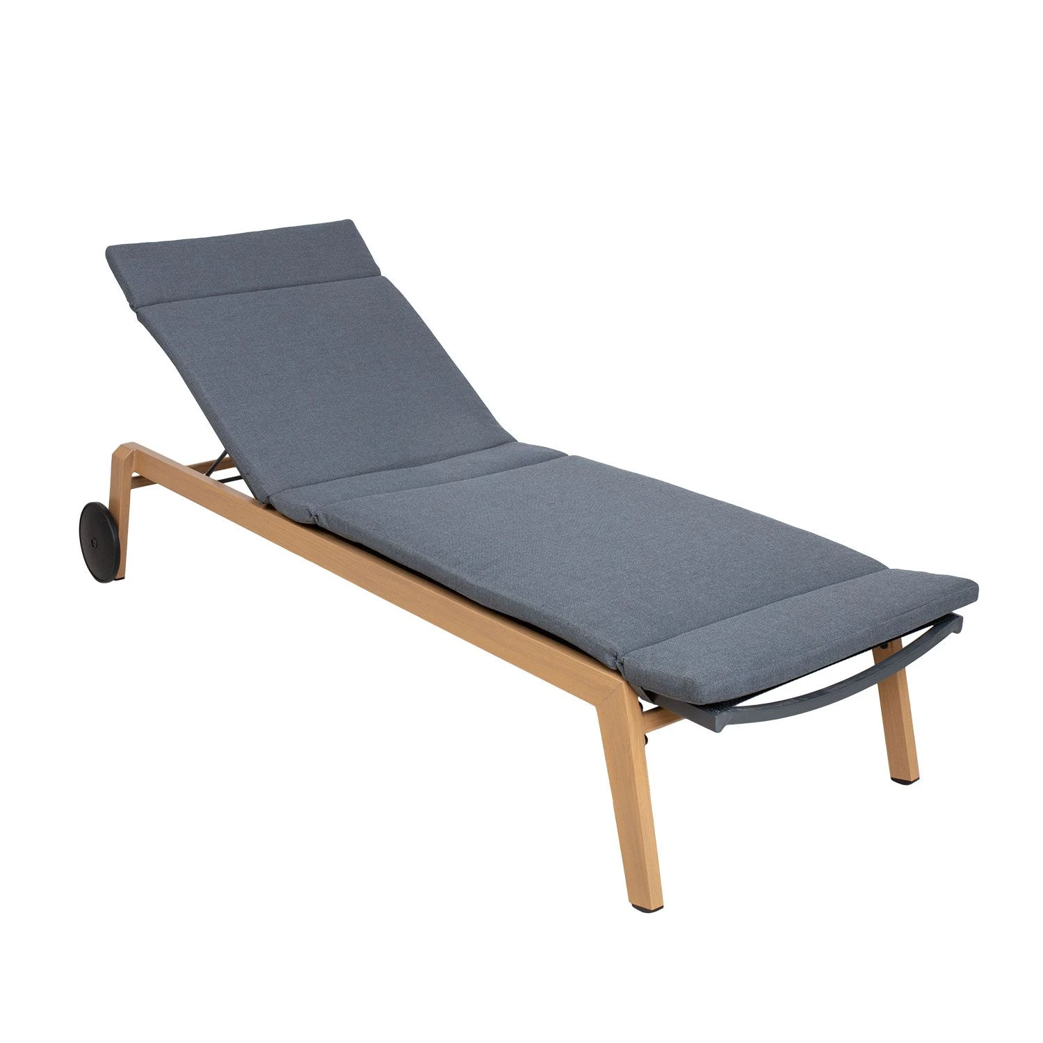 Каркас шезлонга SUNS выполнен из алюминия, окрашенного под дерево, что обеспечивает долговечность и устойчивость к различным погодным условиям. Две колеса облегчают перемещение шезлонга, а серый матрас добавляет элегантности. Регулируемая по высоте спинка обеспечивают максимальный комфорт во время отдыха. Возможность регулировки спинки в разные положения позволяет найти идеальное положение для релаксации.