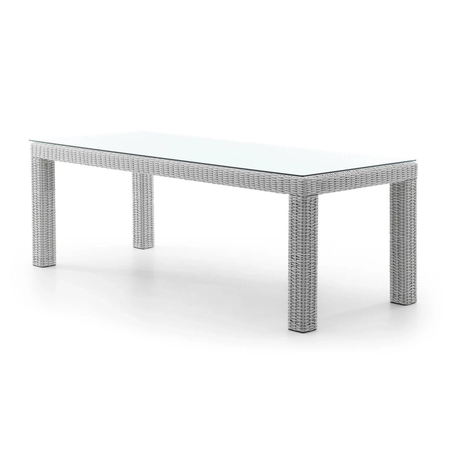 Функциональный, практичный с неискушенной линией садовый стол RAPALLO в белом цвете изготовлен из техноротанга, который полностью устойчив к различным погодным условиям, таким как ультрафиолетовое излучение, влажность и экстремальные температуры, как летом, так и зимой. Стойка стола изготовлена из алюминия с порошковым покрытием и, следовательно, легкая, стабильная, прочная и полностью устойчивая к ржавчине. Столешница RAPALLO покрывает прозрачную плиту из закаленного стекла толщиной 8 мм, что делает ее безопасной для пользователей, практичной, поскольку она не страшна ни тяжелыми чашами, ни горячей посудой. Ножки оснащены специальными подушечками, которые обеспечивают устойчивость на скользкой поверхности, защищая их от царапин.